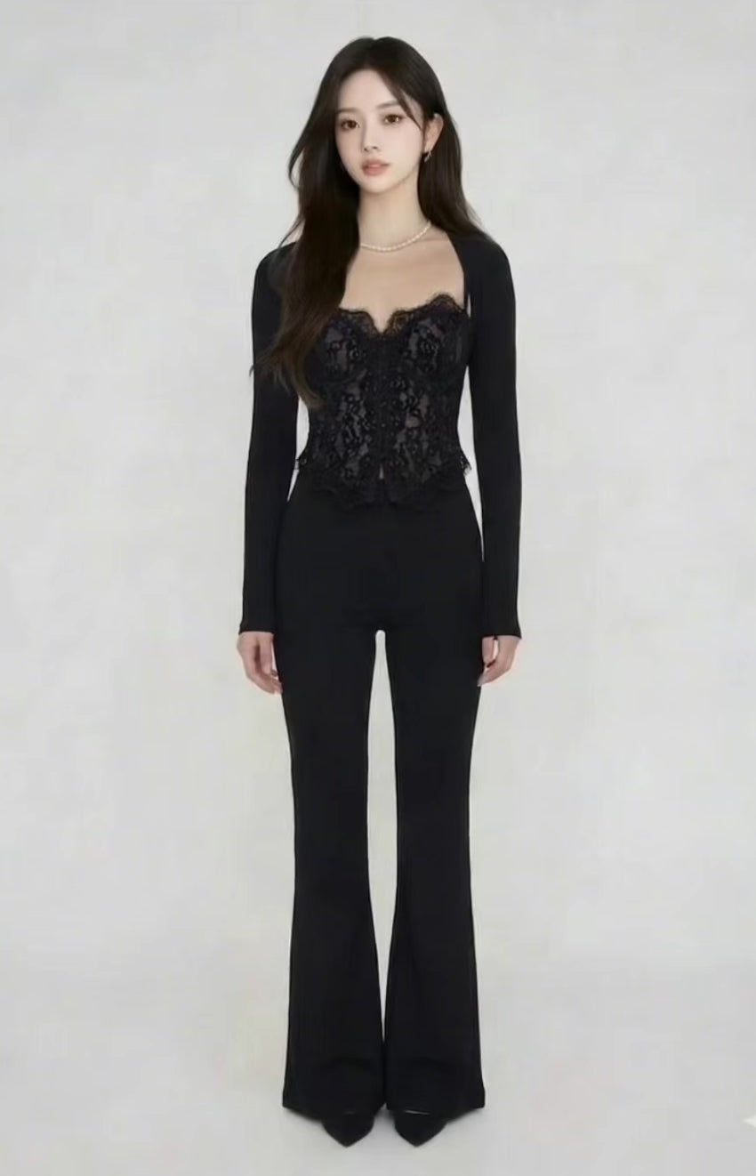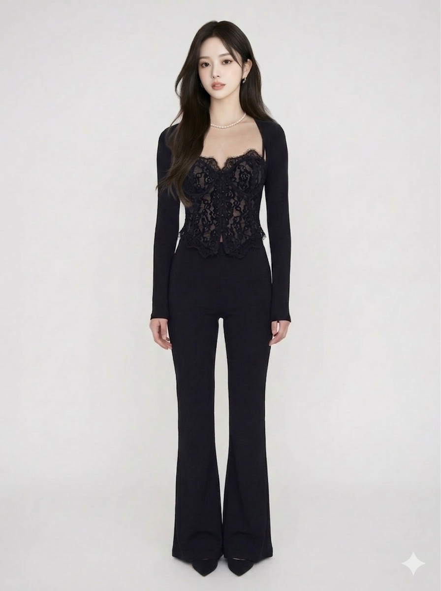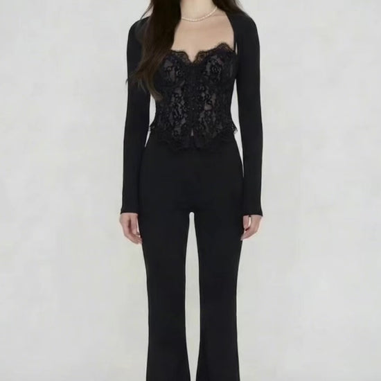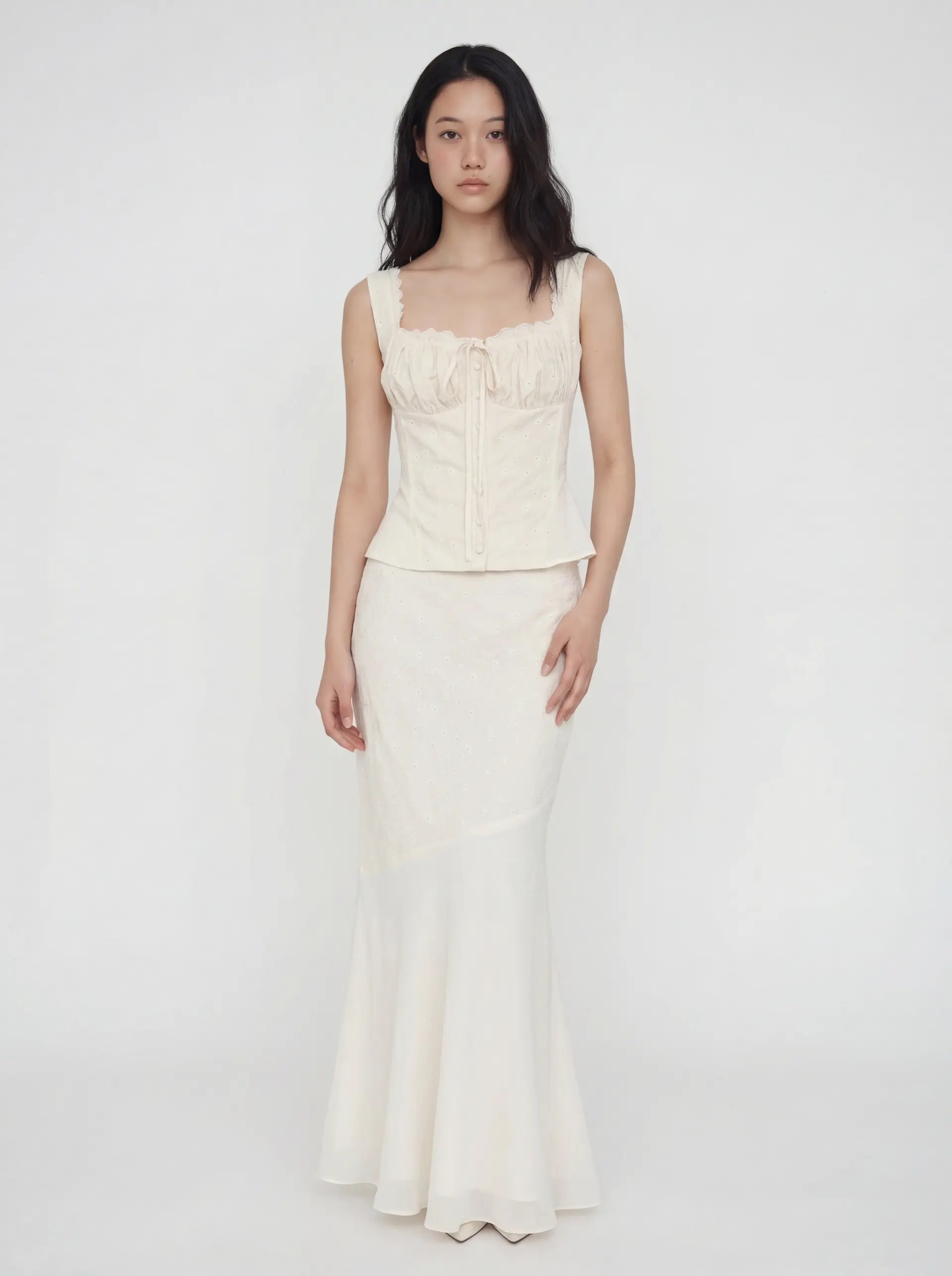 CLAIRE is a two-piece set that moves between effortless and refined — a lace-trimmed corset top paired with a fluid mermaid skirt, both in the softest ivory.